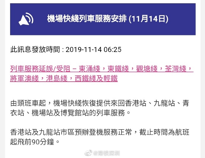 見圳客戶端·深圳新聞網(wǎng)2019年11月14日訊 過關(guān)香港的旅客注意:今天(14日)凌晨5:05分,港鐵發(fā)通知調(diào)整列車運營服務(wù)時間。
