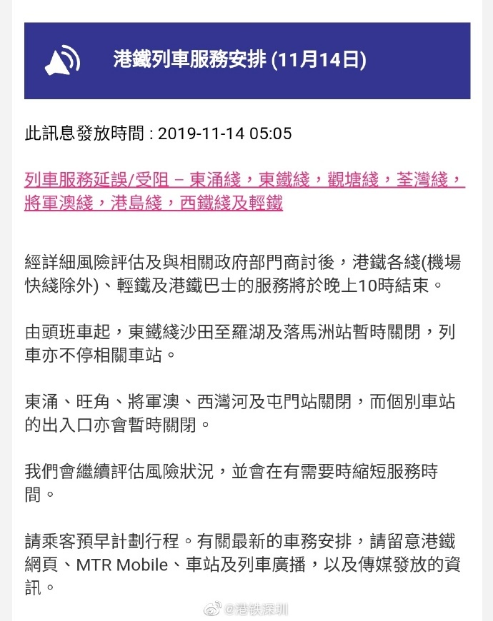 據(jù)港鐵官網(wǎng)目前最新消息,11月14日,港鐵各線(機場快線除外)、輕鐵及港鐵巴士的服務(wù)將于晚上10時結(jié)束,東涌線、東鐵線、觀塘線、荃灣線、將軍澳線、港島線、西鐵線及輕鐵列車服務(wù)延誤/受阻。