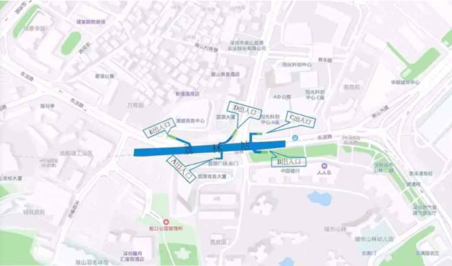 荔林站位于東濱路與南新路交叉口上,車站出入口共計5個,A出入口位于荔園商務大廈北側(cè),B出入口位于城市山林廣場北側(cè),C出入口位于陽光科創(chuàng)東南側(cè),D出入口位于荔源大廈東側(cè),E出入口位于濠盛商務中心南側(cè)