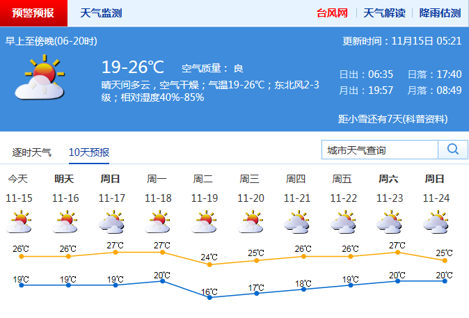 見圳客戶端·深圳新聞網(wǎng)2019年11月15日訊 記者從深圳市氣象臺(tái)了解到,15日晴天間多云,空氣干燥;氣溫19-26℃;東北風(fēng)2-3級(jí);濕度40%-80%。16-17日晴天間多云,早晚清涼,部分時(shí)間能見度較差。18-20日新一股冷空氣影響,北風(fēng)明顯加大,氣溫下降。