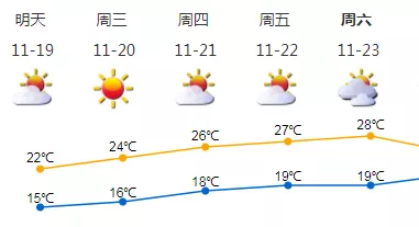 未來(lái)幾天天氣提示:本周前中期冷空氣影響氣溫明顯下降:受新一股冷空氣影響,周一午后至傍晚北風(fēng)開始加大,最大陣風(fēng)7-8級(jí),夜間至周二氣溫明顯下降,周二早晨最低氣溫降至14-15℃;周三日白天風(fēng)力減弱;周四至周末晴天到多云,氣溫回升。港口碼頭及海上活動(dòng)注意防風(fēng);