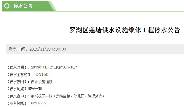 見圳客戶端·深圳新聞網(wǎng)2019年11月21日訊 據(jù)深圳市水務(wù)局消息,11月21日,福田、南山、羅湖區(qū)均有小區(qū)計(jì)劃停水,其中羅湖區(qū)鵬興花園一期從早上8時30分至下午18時停水,其它地方均在晚間。計(jì)劃停水安排如下: