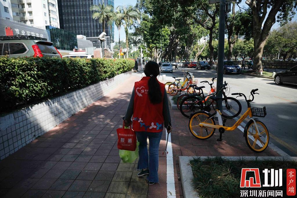 2019年11月22日,福田區(qū),一位義工正在將路邊的共享單車擺放整齊。