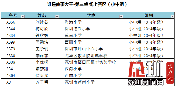 附:“誰是故事大王·第三季”-線上賽區(qū)晉級深圳市復賽名單