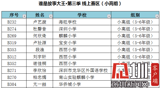 見圳客戶端、深圳新聞網2019年11月22日訊 (見圳客戶端、深圳新聞網記者 陳彬)11月22日,“誰是故事大王·第三季”線上賽區(qū)晉級深圳市復賽的名單出爐,最終,小中組劉沐芯、梅可欣、鐘欣妍等10人,小高組盧藝漩、杜磬音、何欣倚等10人,從線上賽區(qū)1000多人中脫穎而出,晉級深圳市復賽。自此,“誰是故事大王·第三季”的海選全部結束,從36個“校園賽區(qū)”、“南山分賽區(qū)”、“線上分賽區(qū)”、“特約專場”等賽區(qū)晉級的240位學生成功進入深圳市復賽,深圳市復賽將于12月14日(小中組)、12月15日(小高組)進行。