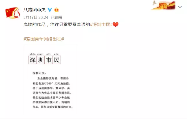 就連共青團(tuán)中央都點(diǎn)名表?yè)P(yáng):“高端的作品,往往只需要最普通的#深圳市民#”