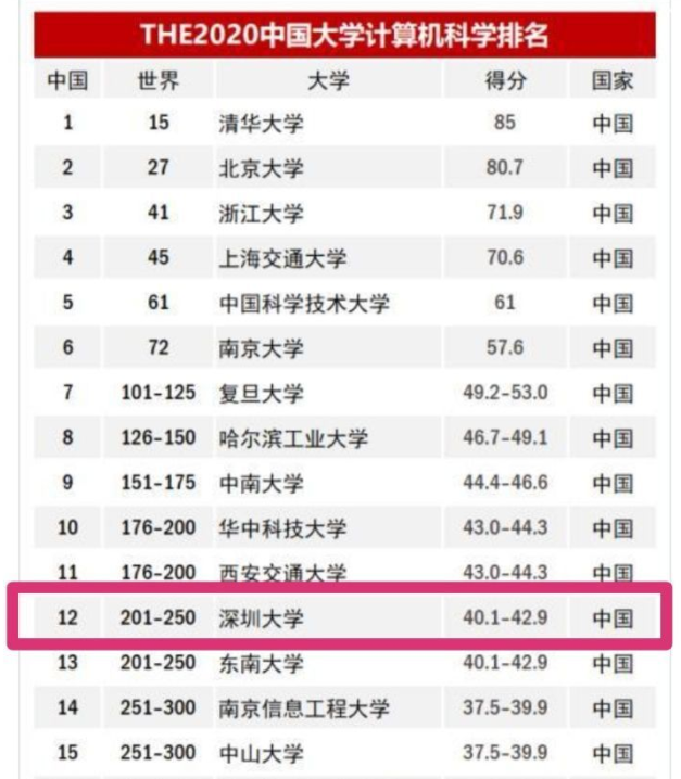 9月份,泰晤士高等教育公布了2020世界大學(xué)排名,近日又對(duì)計(jì)算機(jī)科學(xué)專業(yè)等數(shù)個(gè)熱門(mén)學(xué)科進(jìn)行排名更新。今年參與泰晤士計(jì)算機(jī)科學(xué)排名的大學(xué)從去年的684所擴(kuò)大到749所,最新排名顯示,中國(guó)內(nèi)地有6所大學(xué)的計(jì)算機(jī)科學(xué)專業(yè)進(jìn)入世界百?gòu)?qiáng)。深圳大學(xué)在中國(guó)內(nèi)地大學(xué)計(jì)算機(jī)科學(xué)專業(yè)中位列第12,較上一年度提升了1位,去年世界排名位于301-400之間,今年進(jìn)階至201-250位之間。