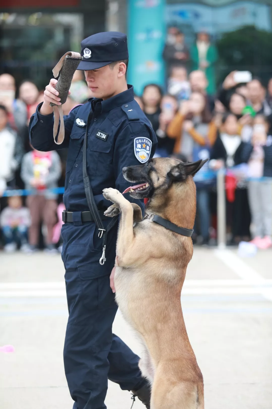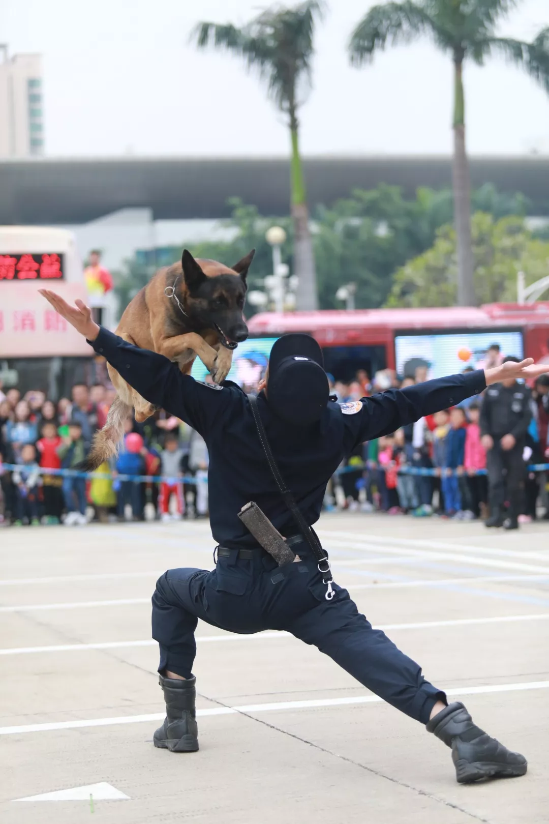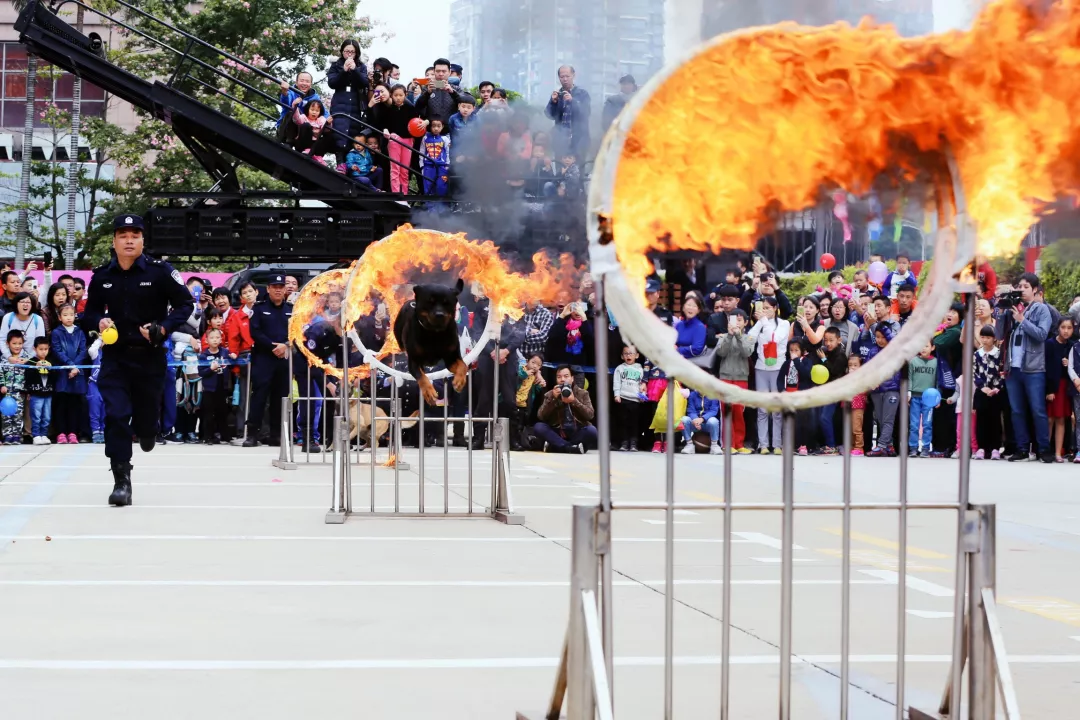 演出科目:跳躍人體障礙、實(shí)戰(zhàn)撲咬、箱包搜索、解救人質(zhì)、跳火圈等