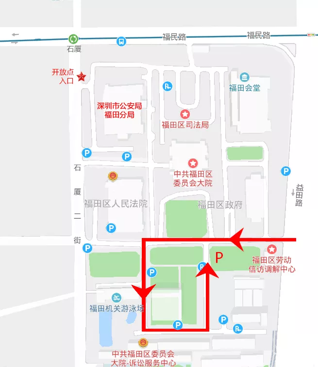 可乘坐公交線路:34路、73路、202路、303路、b689路、b957路、m133路、m389路、m390路,至福田區(qū)委站下車