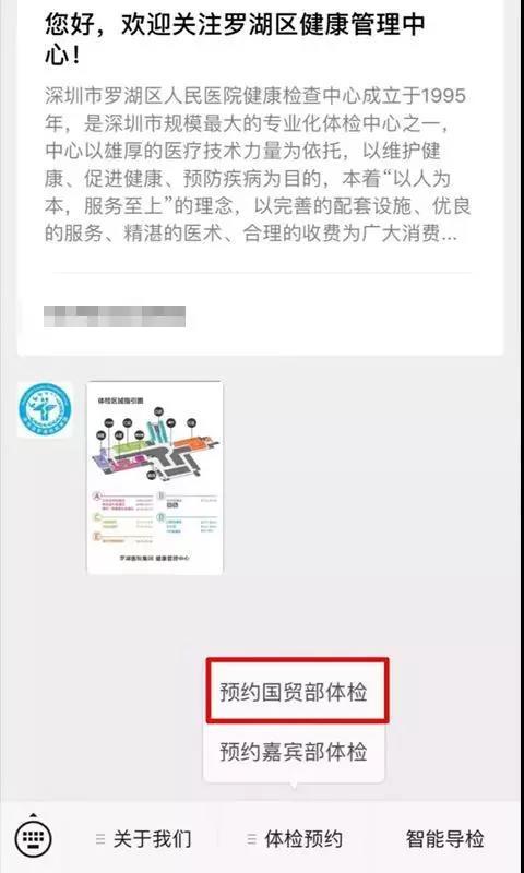 首先,關(guān)注公眾號“羅湖醫(yī)院集團(tuán)健康管理中心”,進(jìn)入公眾號點(diǎn)擊菜單欄“預(yù)約國貿(mào)部體檢”。