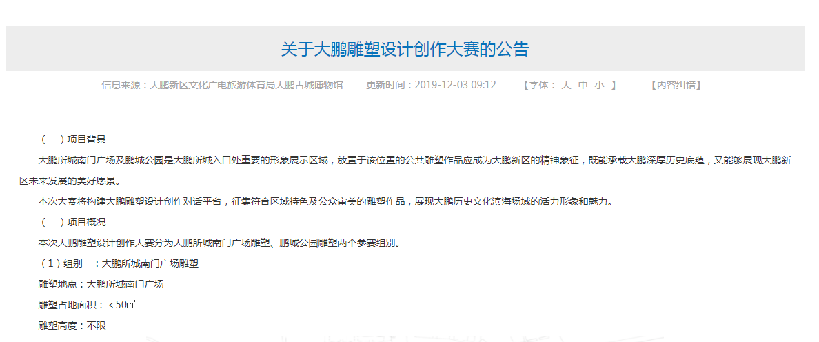 見圳客戶端·深圳新聞網(wǎng)2019年12月3日訊 為了展現(xiàn)大鵬歷史文化濱海場域的活力形象和魅力,12月3日,大鵬新區(qū)文化廣電旅游體育局大鵬古城博物館啟動大鵬雕塑設(shè)計創(chuàng)作大賽,征集大鵬所城南門廣場及鵬城公園雕塑作品,參賽不限單位或個人,最終每組作品都將評選出6名獲獎?wù)撸瑔雾?xiàng)最高獲4萬元獎金,總獎金22萬元。