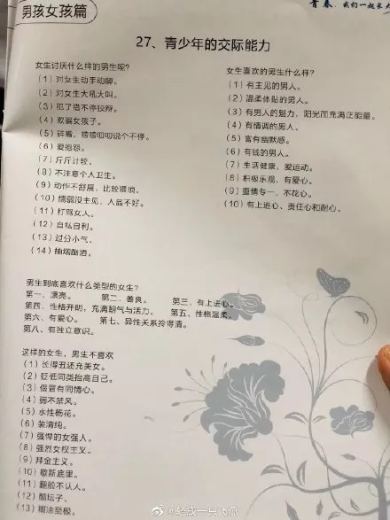 中國新聞網(wǎng)2019年12月6日訊 有網(wǎng)友舉報稱,深圳市龍華區(qū)發(fā)放的《中小學(xué)青春期心理生理衛(wèi)生常識手冊》中存在性別歧視等問題,有“這樣的女生,男生不喜歡”,“女生喜歡的男生什么樣?(6):有錢”,“男生不喜歡的女生什么樣?(9):拜金”等種種不當表述。12月5日,深圳市龍華區(qū)教育局回應(yīng)稱,已立即停止該項目,同時安排收回所有已下發(fā)的資料冊。