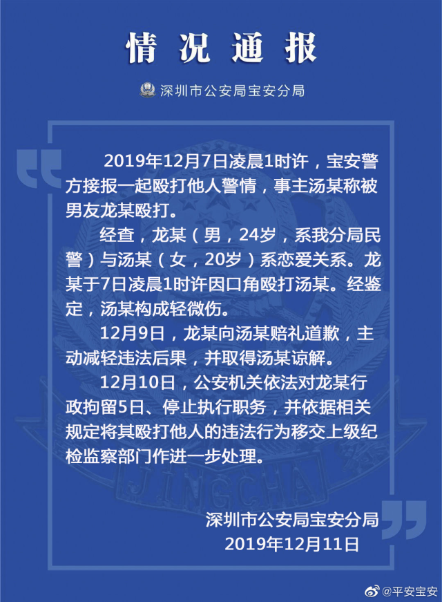 見圳客戶端·深圳新聞網(wǎng)2019年12月12日訊 近日,有媒體報(bào)道了深圳女子被男友從家打到樓道,引發(fā)社會(huì)廣泛關(guān)注。12月11日,深圳市公安局寶安分局發(fā)布通報(bào)稱,家暴施暴男子系寶安分局民警,公安機(jī)關(guān)依法對(duì)其行拘5日,停止執(zhí)行職務(wù)。