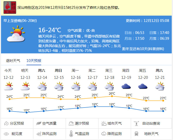 見圳客戶端·深圳新聞網(wǎng)2019年12月12日訊 12日深圳晴天間多云,空氣極度干燥,早晨中西部地區(qū)有輕微到輕度灰霾,中午前后風(fēng)力加大,沿海、高地和海區(qū)最大陣風(fēng)6級(jí)左右,能見度好轉(zhuǎn);氣溫16-24℃。