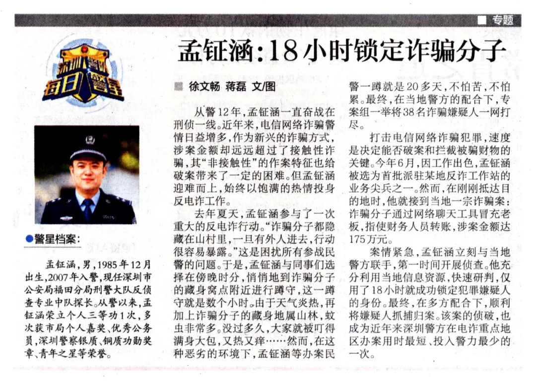 孟鉦涵,男,1985年12月出生,2007年入警,現(xiàn)任深圳市公安局福田分局刑警大隊反偵查專業(yè)中隊探長。從警以來,孟鉦涵榮立個人三等功1次,多次獲市局個人嘉獎、優(yōu)秀公務(wù)員,深圳警察銀質(zhì)、銅質(zhì)功勛獎?wù)隆⑶嗄曛堑葮s譽(yù)。