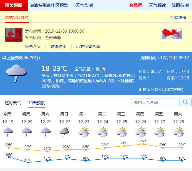 見圳客戶端·深圳新聞網(wǎng)2019年12月19日訊 深圳市氣象局預(yù)計(jì)18日夜間至21日冷空氣影響,轉(zhuǎn)陰天,有分散小雨,沿海、高地和海區(qū)陣風(fēng)6-7級(jí),氣溫下降,20日最低氣溫15℃;22日午后轉(zhuǎn)多云,23-25日可見陽光,氣溫回升。