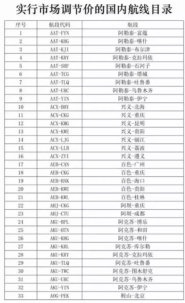 民航局最新《實(shí)行市場(chǎng)調(diào)節(jié)價(jià)的國(guó)內(nèi)航線目錄》部分截圖