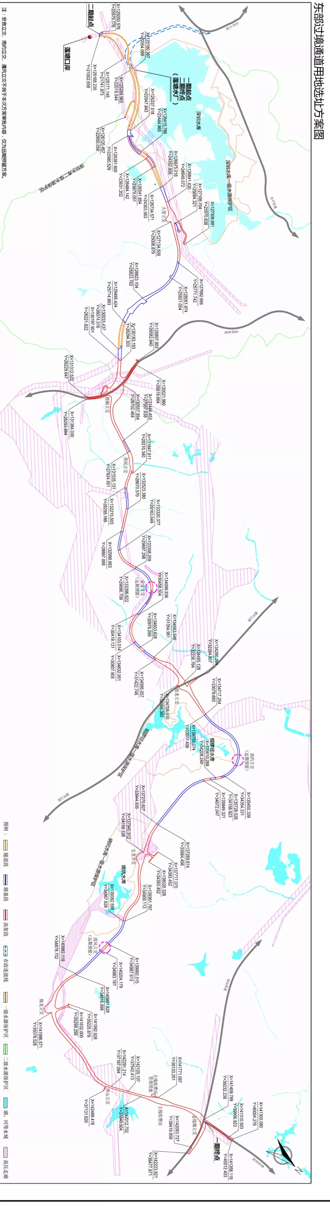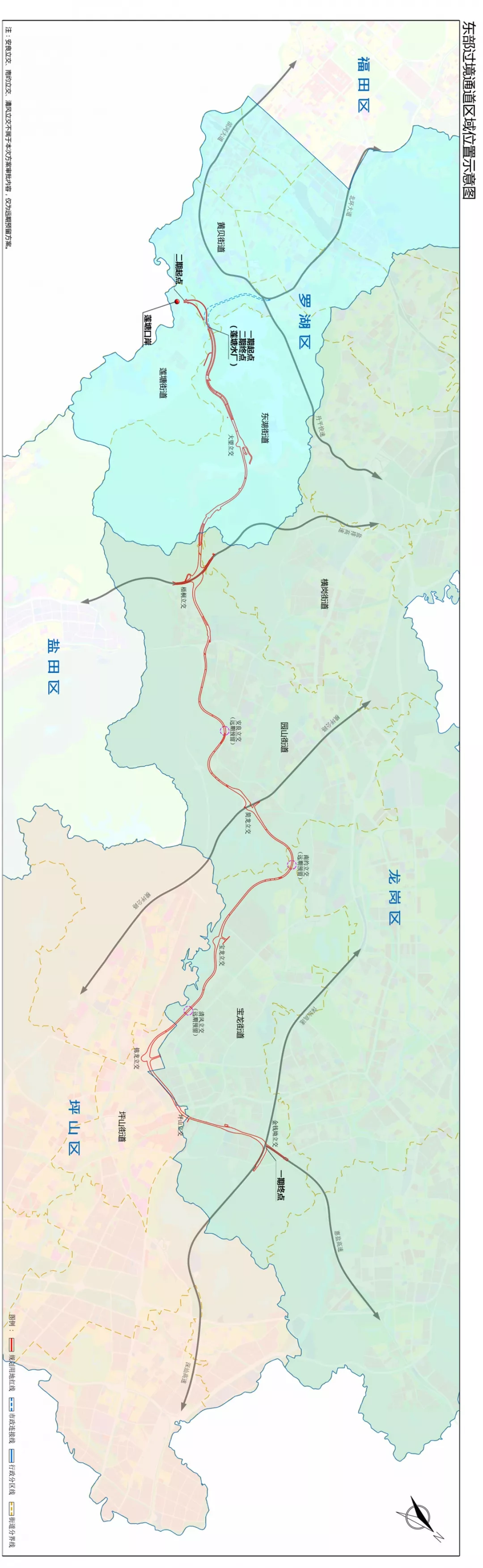 深圳市擬建設(shè)深圳市東部過(guò)境通道,途經(jīng)羅湖區(qū)蓮塘街道、黃貝街道和東湖街道,龍崗區(qū)橫崗街道、園山街道和寶龍街道,坪山區(qū)坪山街道,路線全長(zhǎng)約32.2公里。