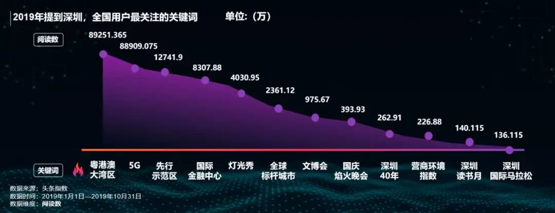 數據顯示,2019年提到深圳,全國網友最關注的三大關鍵詞是“粵港澳大灣區(qū)”、“5G”及“先行示范區(qū)”。