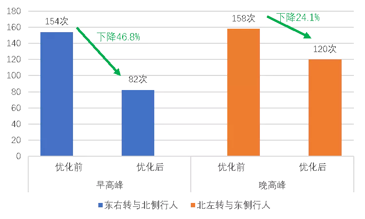 拆分北進(jìn)口機(jī)動(dòng)車時(shí)間,行人晚啟,以減少北進(jìn)口左轉(zhuǎn)機(jī)動(dòng)車與南面出口側(cè)行人交織。