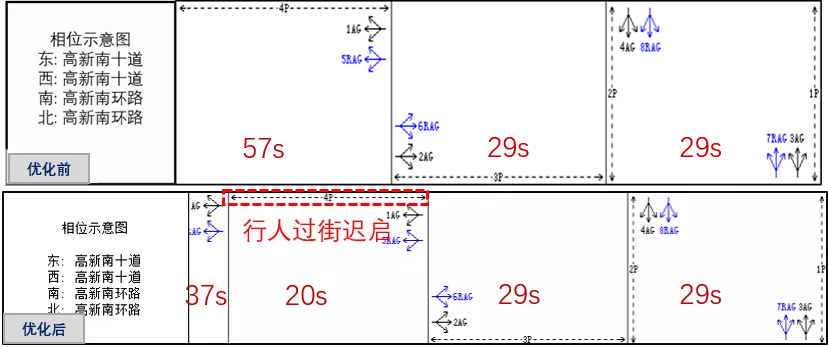 早高峰優(yōu)化前后配時(shí)方案