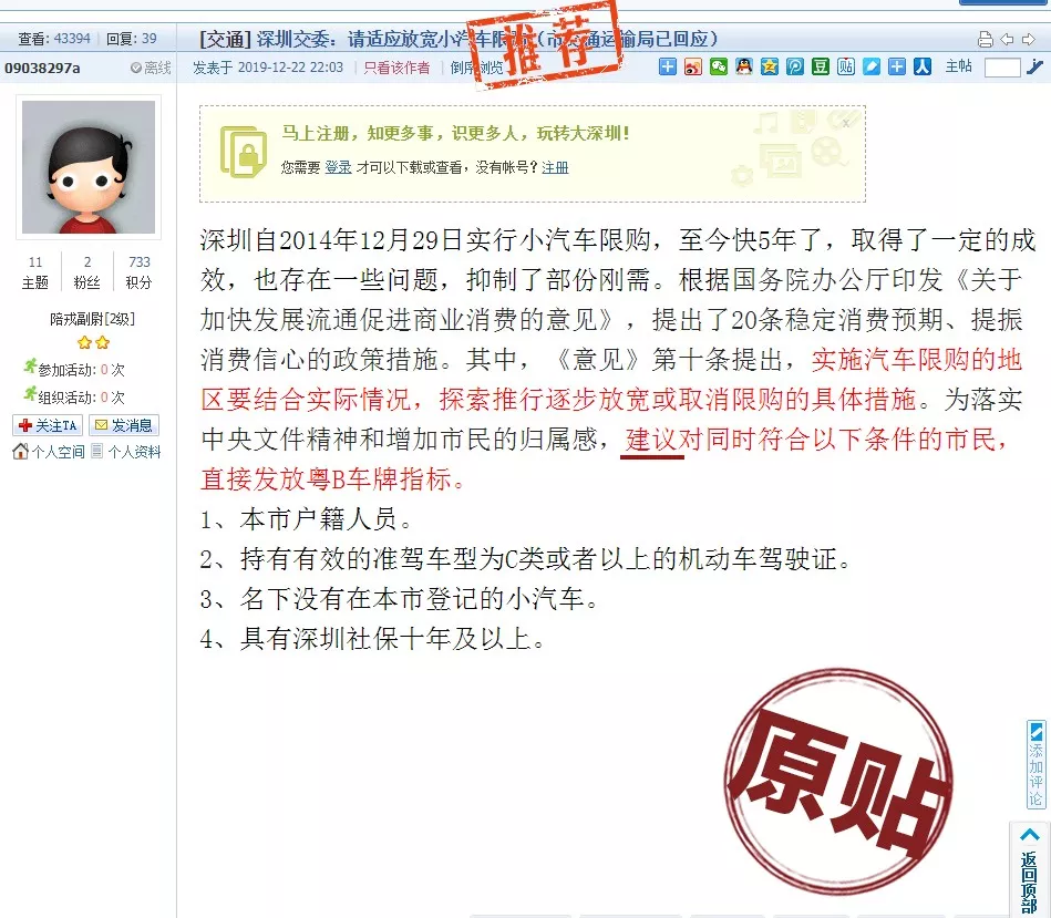 經(jīng)核查,該截圖為網(wǎng)民12月22日在深圳論壇發(fā)布的網(wǎng)帖截選內容,完整內容是該網(wǎng)民對我市小汽車指標增量調控政策提出的建議。