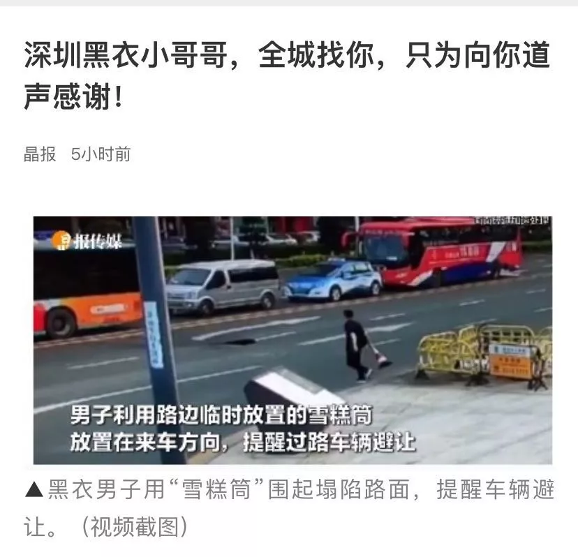 5月16日傍晚時分,一名身穿黑衣的青年男子經(jīng)過南山海德一路和后海濱路交匯處時發(fā)現(xiàn)路面有塌陷并出現(xiàn)不小的洞口,車輛擦邊迅疾而過險象環(huán)生,于是從路邊找來若干雪糕筒擺在洞口來車方向提醒司機(jī)繞洞而行,從而避免了交通事故的發(fā)生。