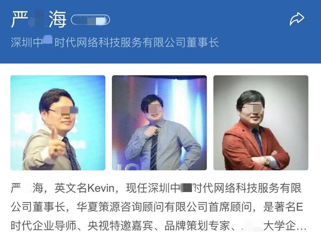 據(jù)介紹,董事長“嚴某海”對外宣傳資料顯示:著名E時代企業(yè)導師、品牌策劃專家、某知名大學企業(yè)轉(zhuǎn)型升級總裁班實踐導師,擔任過多家知名企業(yè)的顧問。據(jù)被抓獲的團伙成員交代,嚴某海自稱擁有雙碩士學歷,是香港大學學者,還是牛津大學博士。