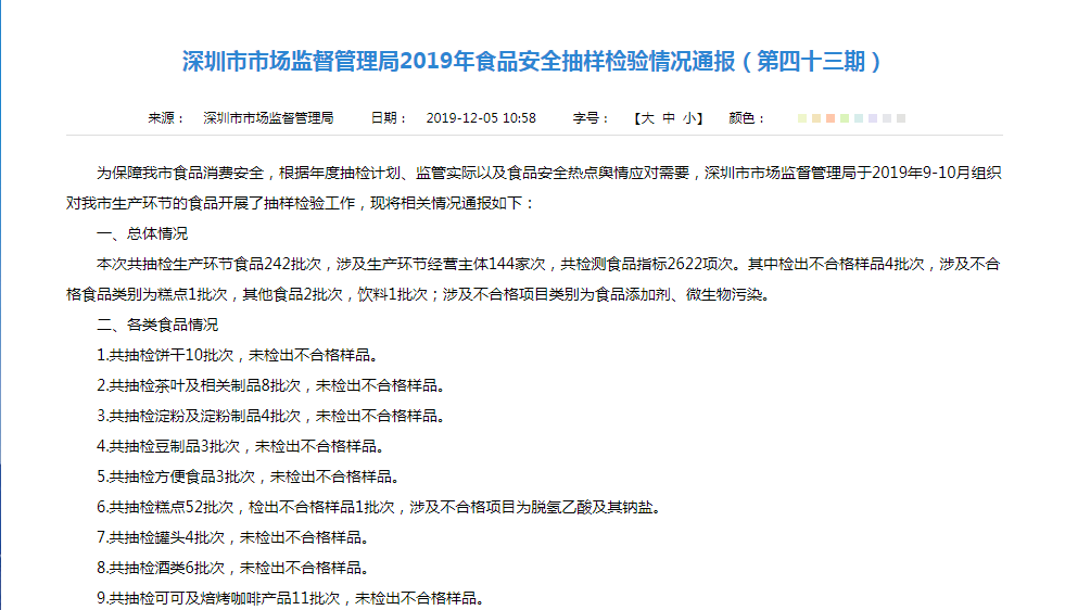 深圳市市場監(jiān)管局新一期抽檢通報