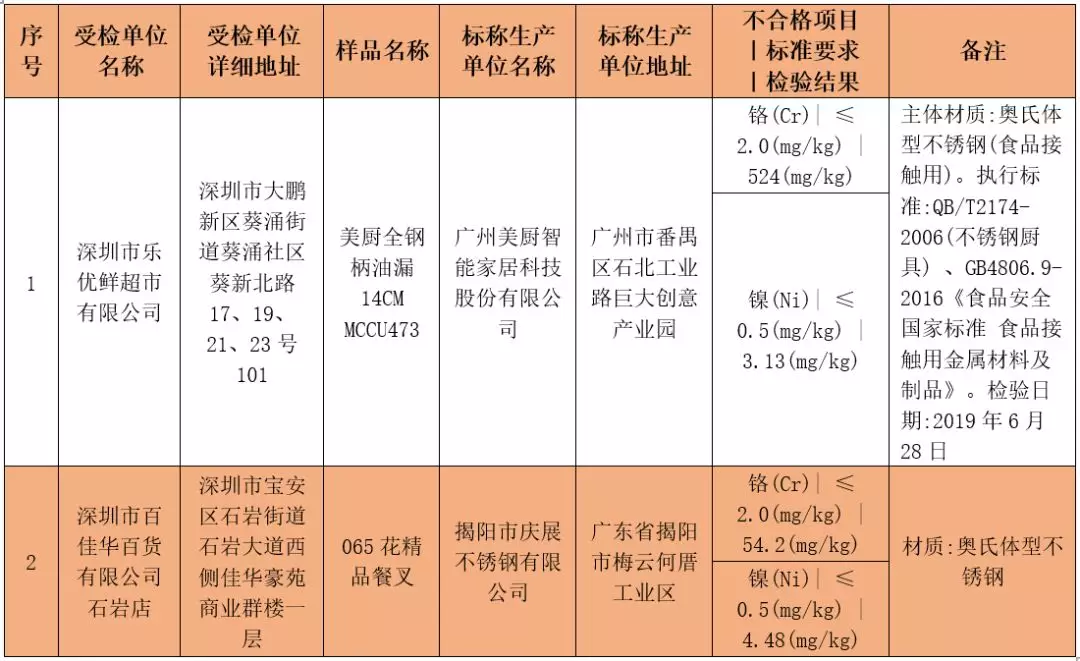 本次共抽檢生產(chǎn)及流通環(huán)節(jié)食品相關(guān)產(chǎn)品1174批次,涉及生產(chǎn)、流通環(huán)節(jié)經(jīng)營主體256家,共檢測相關(guān)指標(biāo)6822項(xiàng)次。其中檢出不合格樣品2批次,涉及2家受檢單位,均來自流通領(lǐng)域企業(yè);涉及不合格產(chǎn)品類別均為食品接觸用金屬材料及制品;涉及不合格項(xiàng)目均為鎳(Ni)、鉻(Cr)。