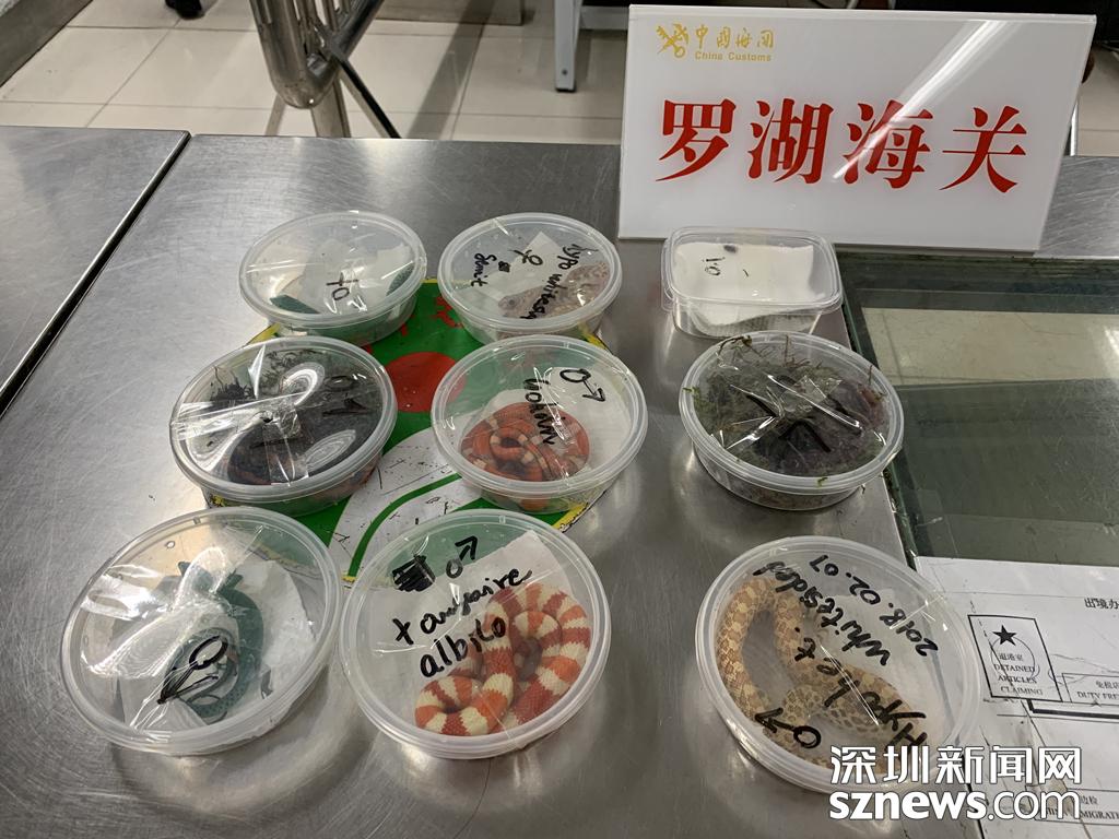 4月19日,一名旅客攜帶洪都拉斯奶蛇、龍紋翡翠蜥蜴等多個品種合計9只爬行綱動物自羅湖口岸入境,被深圳海關(guān)隸屬羅湖海關(guān)當(dāng)場查獲。