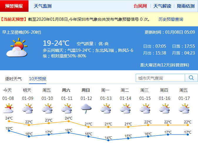 見(jiàn)圳客戶端·深圳新聞網(wǎng)2020年1月8日訊 距離大寒12天 深圳今日最高溫24℃,多云間晴天;氣溫19-24℃;東北風(fēng)3級(jí),陣風(fēng)5-6級(jí);相對(duì)濕度50%-80%。