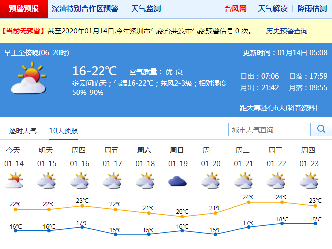 見圳客戶端·深圳新聞網2020年1月14日訊 深圳市氣象局預計14-15日多云為主,14日氣溫15-22℃;16日多云轉陰天,偶有零星小雨;17-19日冷空氣影響,多云到陰天,氣溫下降2-3℃,早晚較涼;20日起氣溫逐日回升。