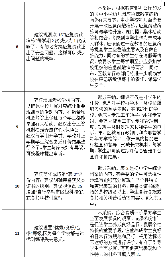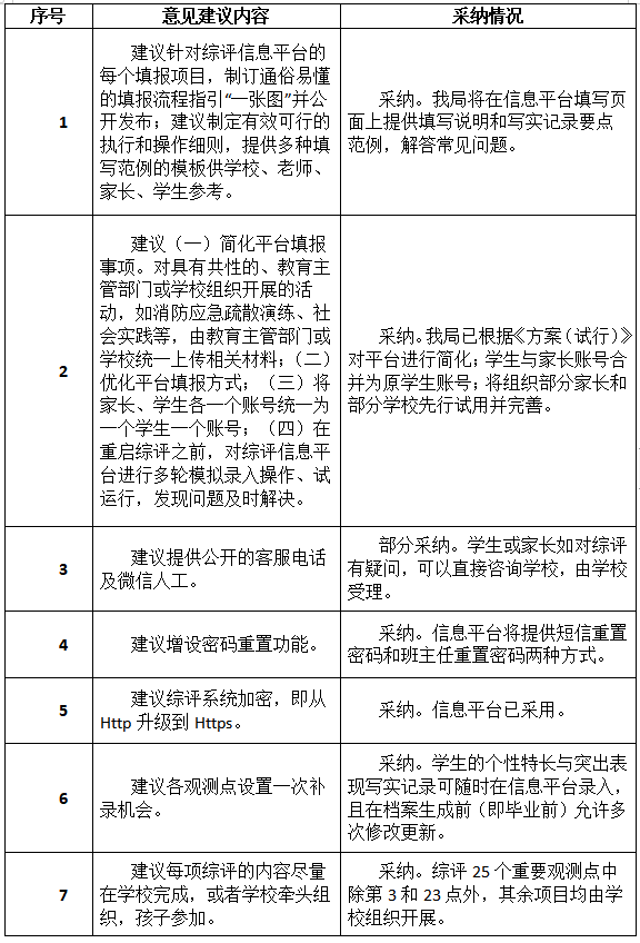 市教育局通報(bào)指出,在意見征集期間,該局共收到304個(gè)郵件及2個(gè)信件。市教育局對上述建議進(jìn)行了統(tǒng)一的分類,這些建議被分成了34類,并組織了專家學(xué)者進(jìn)行了認(rèn)真研究。其中,有關(guān)平臺(tái)簡化、允許修改更新、建立綜評宣導(dǎo)隊(duì)伍等14類建議被采納,另有5類建議被部分采納,余下15類建議沒有被采納。
