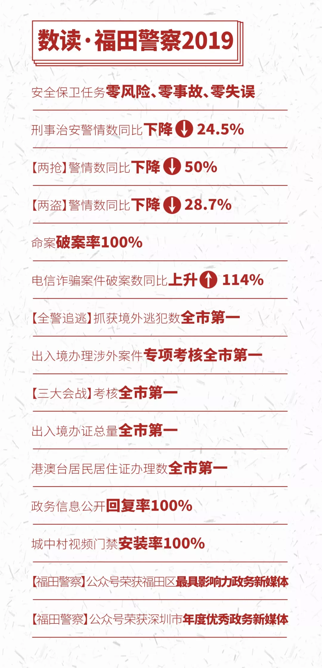 剛剛過去的2019年,是福田公安勇?lián)姑?,砥礪奮進(jìn)的一年,在市局黨委和區(qū)委區(qū)政府的堅(jiān)強(qiáng)領(lǐng)導(dǎo)下,福田公安穩(wěn)中求進(jìn)、攻堅(jiān)克難,穩(wěn)妥應(yīng)對化解系列重大風(fēng)險(xiǎn),有效護(hù)航中心城區(qū)社會政治穩(wěn)定,打贏新中國成立70周年大慶安保和澳門回歸20周年慶典安保攻堅(jiān)戰(zhàn),各項(xiàng)重大安?;顒印傲泔L(fēng)險(xiǎn)、零事故、零失誤”;強(qiáng)力推進(jìn)掃黑除惡、“颶風(fēng)2019”等一系列專項(xiàng)行動,合成打擊效能突顯;持續(xù)推動現(xiàn)代化警務(wù)機(jī)制變革,改革攻堅(jiān)蹄疾步穩(wěn);提升社會治安基礎(chǔ)治理工作,治安面貌持續(xù)向好;隊(duì)伍建設(shè)舉措剛?cè)嵯酀?jì),錘煉“四個(gè)鐵一般”的過硬警隊(duì)。