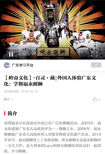 獲獎團隊告訴記者,在籌備階段,他們先是與橋頭醒獅隊了解醒獅的主要流程及文化背景,與教練商量設定主角Luca的學習內容及學習強度。在拍攝階段,團隊采用對Luca全程跟拍的方式,力求拍攝到他對醒獅文化更真實自然的體驗過程。并在剪輯階段參考電視綜藝節(jié)目的包裝方式,對視頻進行后期剪輯和包裝,讓視頻呈現更活潑有趣的風格效果。視頻推出后,在“學習強國”深圳學習平臺、深圳新聞網首頁、騰訊等全網各平臺發(fā)布,并得到迅速地轉發(fā)和點贊,閱讀量達到20.5萬次。