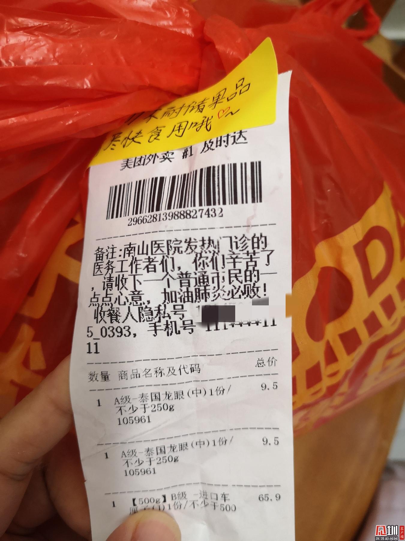 見圳客戶端·深圳新聞網(wǎng)2020年2月1日訊 (見圳客戶端、深圳新聞網(wǎng)記者 劉夢婷 通訊員 深協(xié)和)“老淚縱橫!”1月30日晚上8點(diǎn)56分,華中科技大學(xué)協(xié)和深圳醫(yī)院(南山醫(yī)院)手外科護(hù)士王敏在朋友圈曬了一張照片,瞬時網(wǎng)友們紛紛點(diǎn)贊。照片里是一個紅色塑料袋上貼著一張外賣單,備注上寫著,“南山醫(yī)院發(fā)熱門診的醫(yī)務(wù)工作者們,你們辛苦了!請收下一個普通市民的一點(diǎn)點(diǎn)心意,加油,肺炎必?。 ?/p>