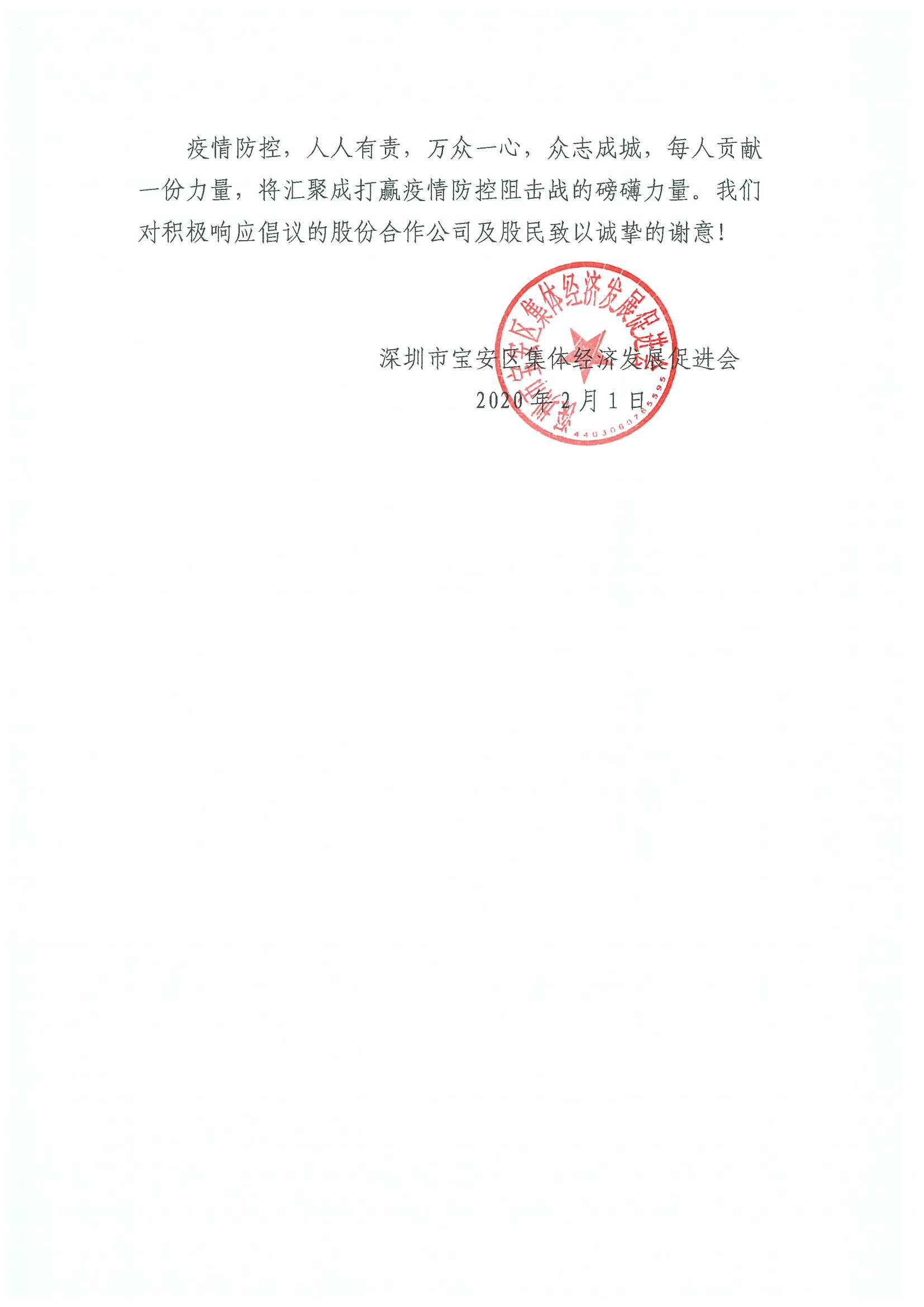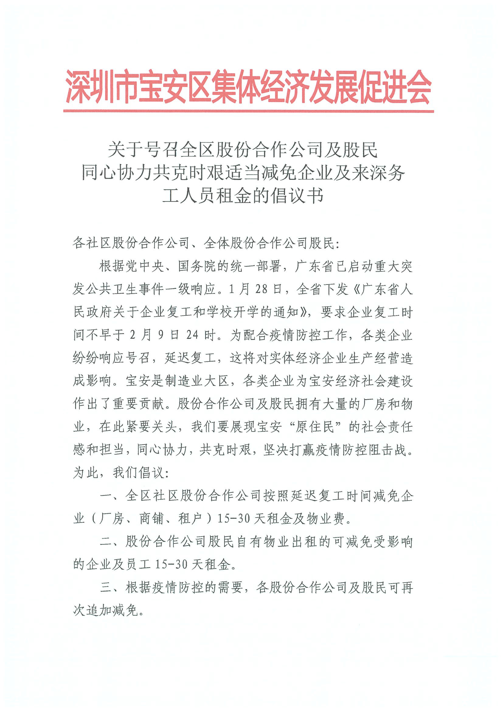 深圳新聞網(wǎng)寶安訊 “疫情防控,人人有責(zé),萬(wàn)眾一心,眾志成城,每人貢獻(xiàn)一份力量,將匯聚成打贏疫情防控阻擊戰(zhàn)的磅礴力量?!?月1日晚,寶安區(qū)集體資產(chǎn)管理局指導(dǎo)寶安區(qū)集體經(jīng)濟(jì)發(fā)展促進(jìn)會(huì)向?qū)毎矃^(qū)各社區(qū)股份合作公司、全體股份合作公司股民發(fā)出《同心協(xié)力共克時(shí)艱適當(dāng)減免企業(yè)及來深務(wù)工人員租金的倡議書》,號(hào)召全區(qū)股份合作公司及股民適當(dāng)減免企業(yè)及來深務(wù)工人員15-30天租金及物業(yè)費(fèi),并根據(jù)疫情防控的需要可再次追加減免。