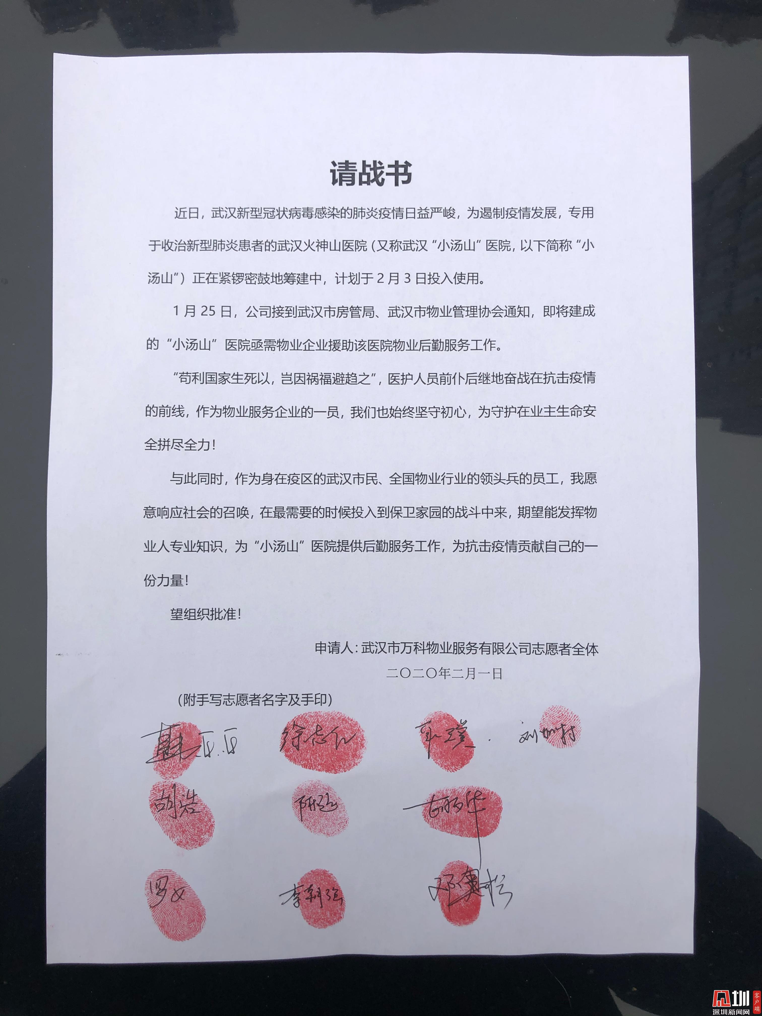 此次志愿者報(bào)名得到了大家的積極響應(yīng)。1月25日,武漢萬(wàn)科物業(yè)接到武漢市物業(yè)管理協(xié)會(huì)的通知,希望萬(wàn)科物業(yè)征集20名志愿者支援武漢火神山醫(yī)院。當(dāng)晚倡議書發(fā)出后,已有11人報(bào)名,到26日下午3時(shí),報(bào)名人數(shù)增加到40人。這40位自愿報(bào)名者涵蓋了物業(yè)各個(gè)崗位,既有一線員工,也有物業(yè)管理人員。