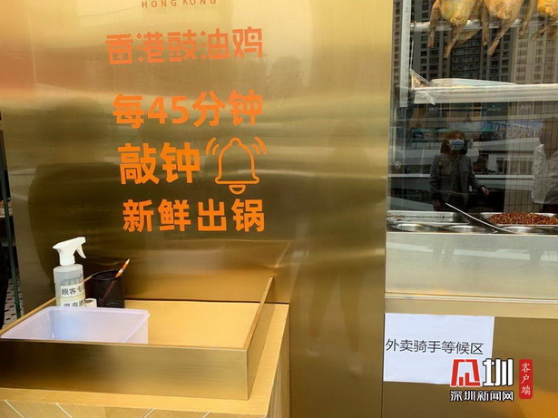 根據相關規(guī)定,兩家餐廳門口均設立預防區(qū)及外賣騎手區(qū),餐廳配備了體溫測試儀及消毒酒精,每位到店的顧客或騎手均需進行體溫檢測及消毒,特別是金戈戈豉油雞餐廳更為市民配備了口罩。