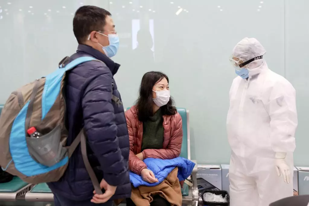 在機(jī)場(chǎng)檢疫站旁,醫(yī)務(wù)人員對(duì)旅客進(jìn)行詢(xún)問(wèn)和醫(yī)學(xué)健康篩查。