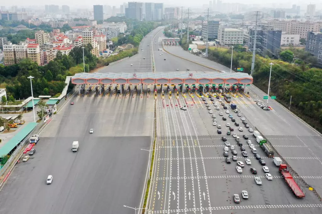 梅觀(guān)高速觀(guān)瀾收費(fèi)站,入深方向的車(chē)輛排隊(duì)依次接受檢查。
