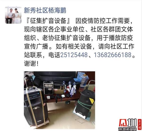 疫情面前,小廣播能發(fā)揮大作用,方便大力宣傳防疫知識。疫情在不斷蔓延,廣播宣傳任務(wù)任務(wù)緊急,而其中新秀社區(qū)一時沒有足夠的擴音設(shè)備,于是,立即向居民、社會團體、企業(yè)等發(fā)出征集令。新秀社區(qū)黨委書記楊海鵬在微信朋友圈發(fā)布了征集信息及聯(lián)系電話。沒想到這征集令一發(fā)出,很快就得到了市民朋友的積極響應(yīng)。