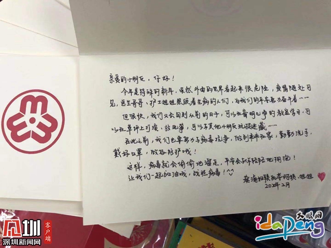 除了疫情防護(hù)的必需品,記者在這份暖心的“抗疫禮包”中還發(fā)現(xiàn)了一封字跡工整的信。信中寫(xiě)道:親愛(ài)的小朋友,你好!今年是特殊的新年,雖然外面的世界看起來(lái)很危險(xiǎn),疫情隨處可見(jiàn),醫(yī)生哥哥、護(hù)士姐姐照顧著生病的人們,為我們的平安努力奮斗著,但很快,我們又會(huì)回到從前的日子……劉贊告訴記者,這些漂亮的字跡出自她的同事肖可之手,雖然沒(méi)能跟姐妹們一起慰問(wèn),但肖可還是希望能盡自己的一份力,讓這份禮包更加溫暖,讓孩子們更加快樂(lè)開(kāi)心。