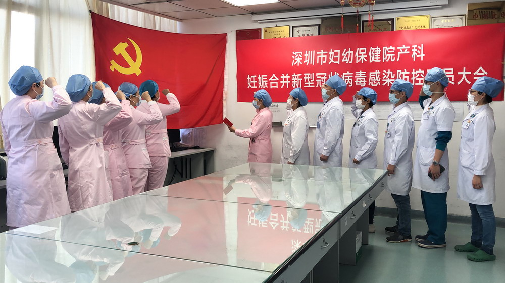 產科自愿參加妊娠合并新冠防控病區(qū)的黨員們,在新成立的病區(qū)重溫入黨誓詞