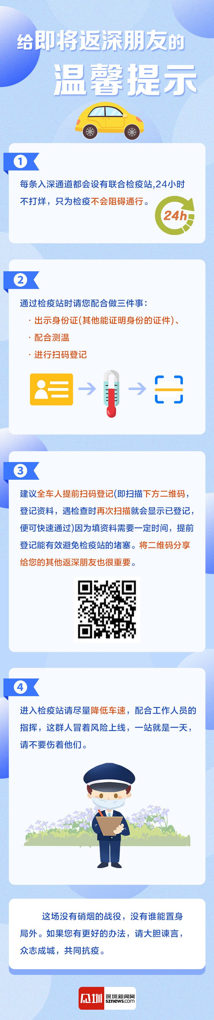 深圳交警提醒市民,提前申報應(yīng)原則上提前一天完成,但提前越早越好,通行檢疫點更快速。因為全市所有入深道路的防疫檢查站都必須對車輛上的人員進(jìn)行體溫檢測,為避免耽誤行程,提前預(yù)約報備能讓通過流程更快捷。