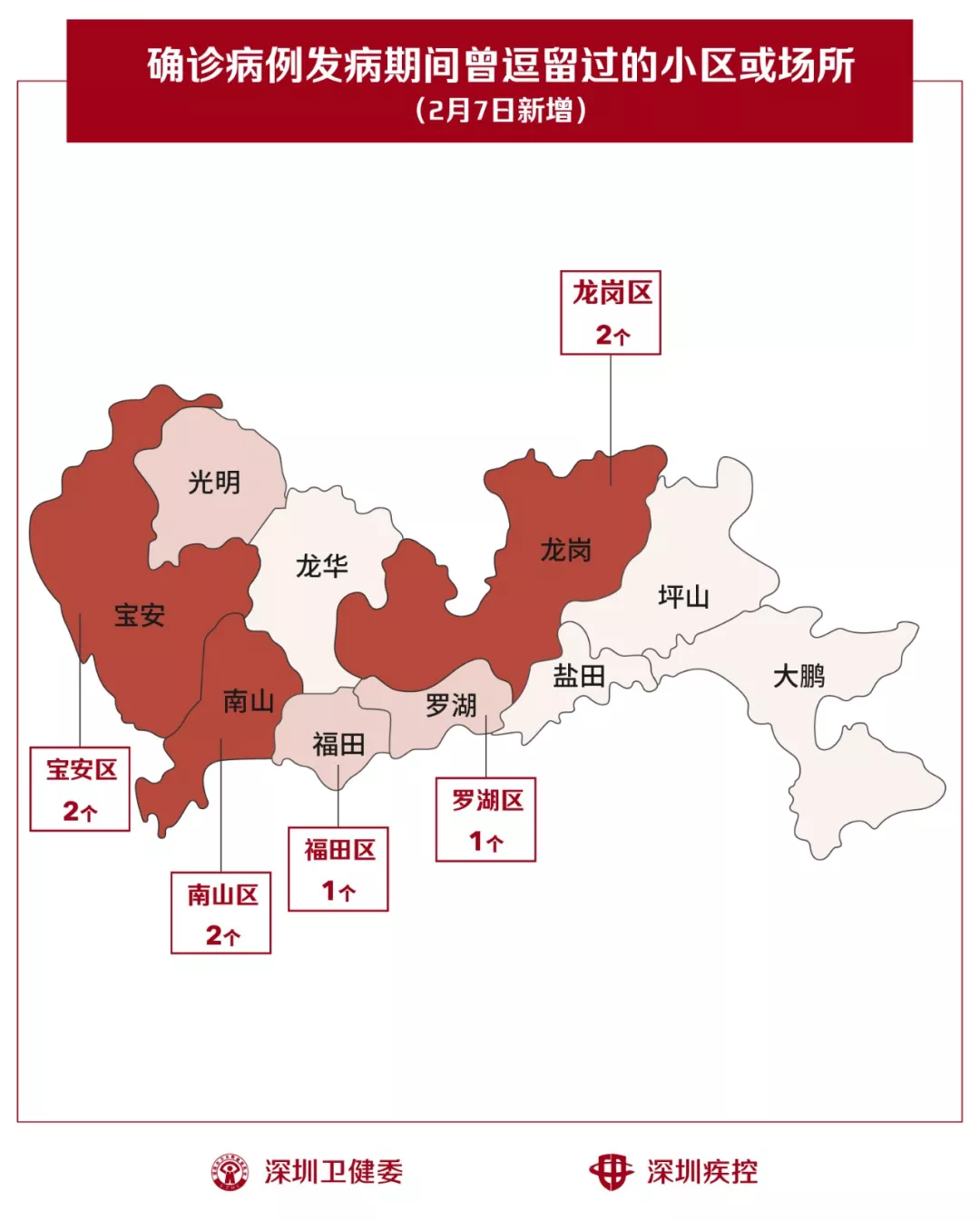 2月7日,疾控專業(yè)人員通過最新的流行病學(xué)調(diào)查確認(rèn),深圳新增8個(gè)小區(qū)(場所),有新確診的病人在出現(xiàn)病征期間曾經(jīng)逗留。
