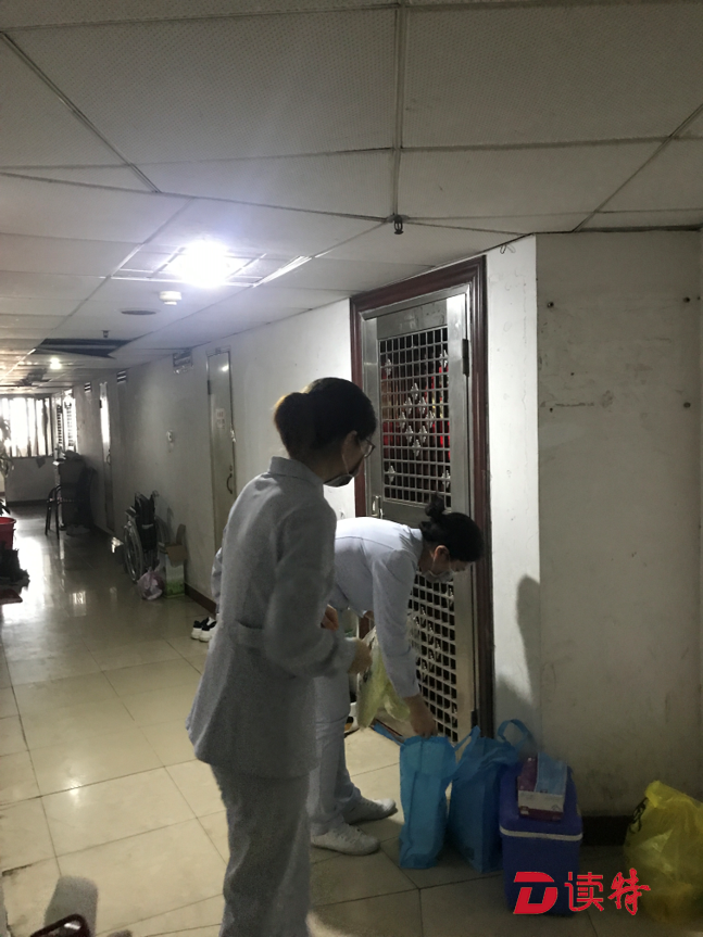 孫女士打開(kāi)門,將工作人員遞進(jìn)去的防護(hù)裝備穿戴完畢。“為了保護(hù)醫(yī)護(hù)人員的安全,減少交叉感染的可能性,所有的上門檢測(cè)都會(huì)在樓道里進(jìn)行。”社康中心工作人員說(shuō)。提前穿好防隔服等防護(hù)裝備、拿檢測(cè)時(shí)給居民坐的凳子、為凳子消毒,開(kāi)始進(jìn)行檢測(cè)前就需要做很細(xì)致的準(zhǔn)備工作。