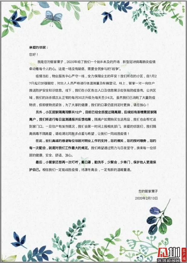 見(jiàn)圳客戶端·深圳新聞網(wǎng)2020年2月13日訊(見(jiàn)圳客戶端·深圳新聞網(wǎng)記者 潘潤(rùn)華)“他們對(duì)疫情的恐懼并不少半分,可卻堅(jiān)持在工作崗位。”“他們就是我們心目中的逆行者。守護(hù)著我們的安全?!苯?,一幕幕暖心畫面在深圳上演,不少業(yè)主紛紛踴躍為物業(yè)員工捐款,以表達(dá)對(duì)這些“平安守護(hù)者”“逆行人”的謝意。