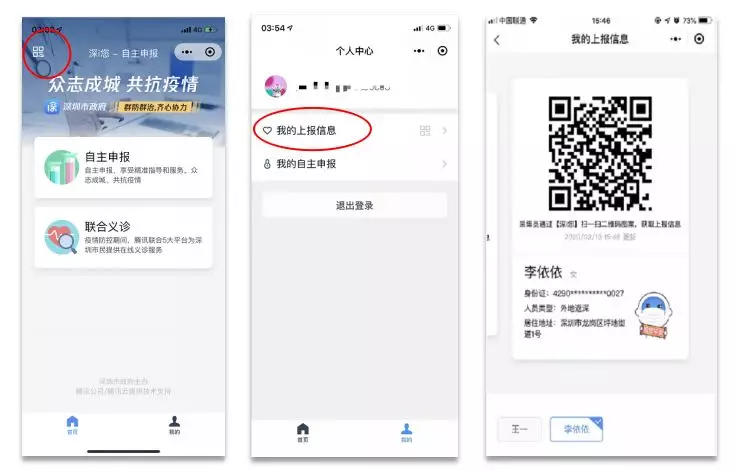 在進(jìn)出小區(qū)時,可在“深i您-自主申報”小程序首頁點(diǎn)擊左上角“二維碼圖標(biāo)”或前往“我的>個人中心”點(diǎn)擊“我的上報信息”向工作人員出示“深i您-自主申報”平臺生成的系統(tǒng)認(rèn)證圖碼,憑該圖碼出入小區(qū),無需作重復(fù)申報。
